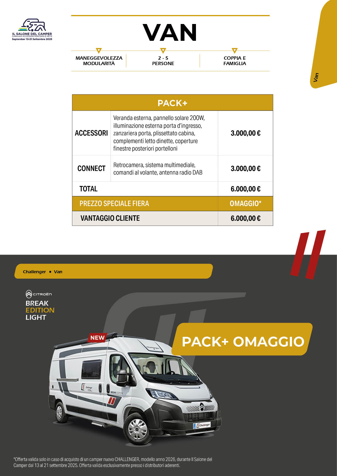 Offerta valida solo in caso di acquisto di un camper nuovo CHALLENGER, modello anno 2026. Offerta valida esclusivamente presso i distributori aderenti.
